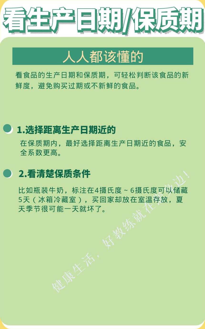 看食品的生產(chǎn)日期和保質(zhì)期,可輕松判斷該食品的新鮮度,避免購(gòu)買過(guò)期或不新鮮的食品。